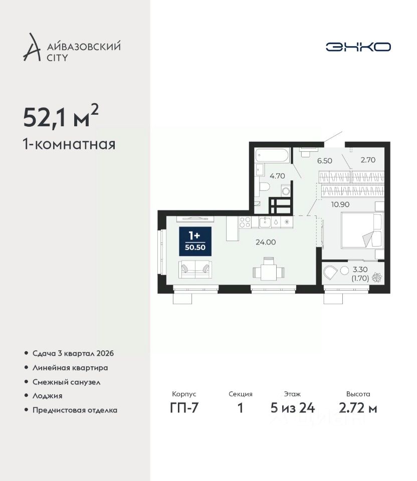 1-комн. квартира от застройщика с предчистовой отделкой в ЖК ''Айвазовский City'' на 5 этаже. Общая площадь: 52.1 кв.м., жилая: 16.4 кв.м., площадь просторной кухни-столовой: 16.8 кв.м. Все окна выходят на одну сторону. В квартире одна лоджия, один совмещенный санузел. Высота потолков 2.72 м.
