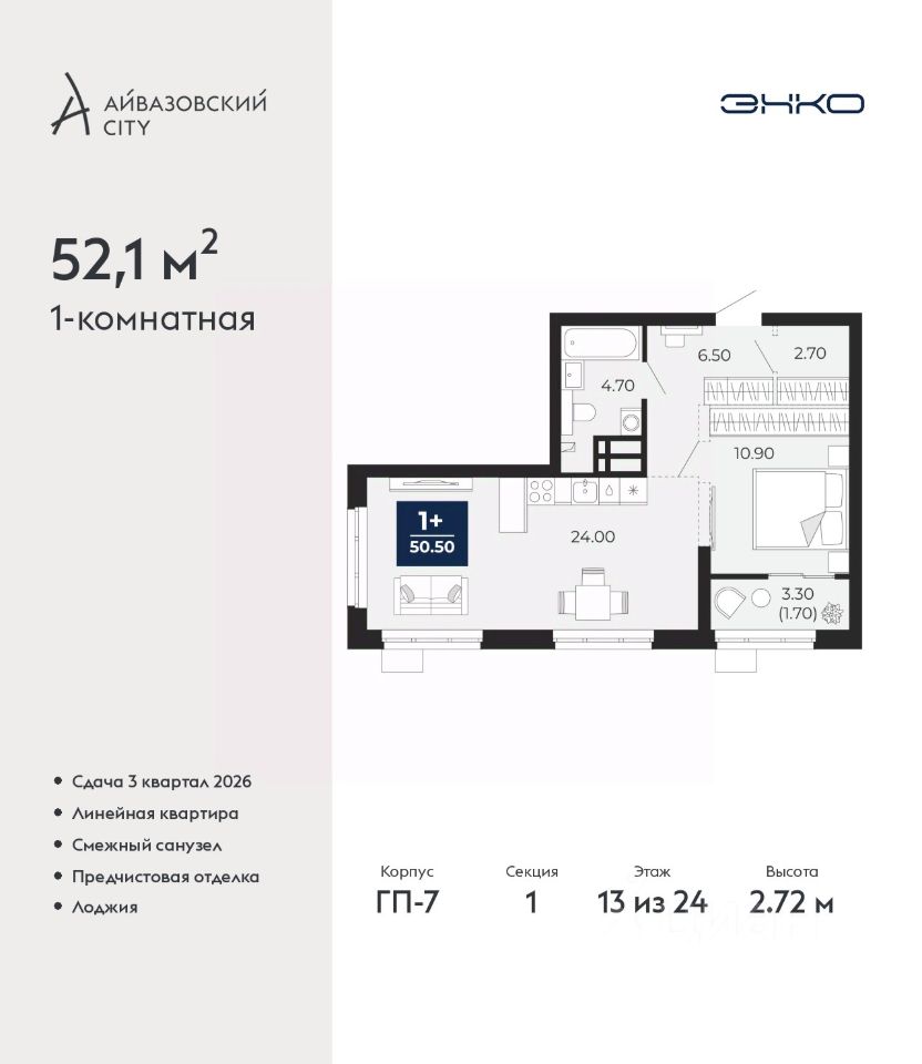 Продается 1-комн. квартира с предчистовой отделкой в ЖК ''Айвазовский City'' на 13 этаже. Общая площадь: 52.1 кв.м., жилая: 16.4 кв.м., площадь просторной кухни-столовой: 16.8 кв.м. Все окна выходят на одну сторону. В квартире одна лоджия, один совмещенный санузел. Высота потолков 2.72 м.
