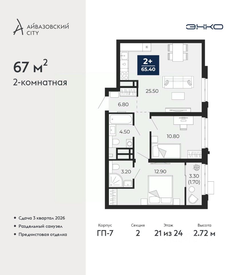 Двухкомнатная квартира от застройщика с предчистовой отделкой в ЖК ''Айвазовский City'' на 21 этаже. Общая площадь: 67 кв.м. Высота потолков 2.72 м.
