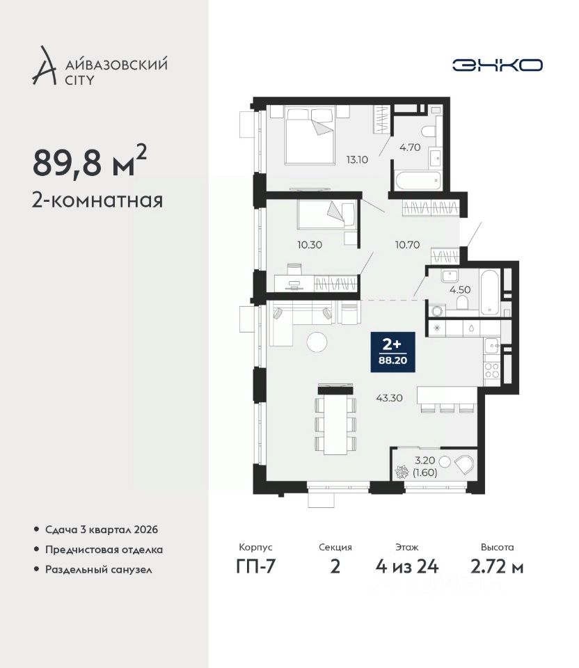 2-комн. квартира с предчистовой отделкой в ЖК ''Айвазовский City'' на 4 этаже. Общая площадь: 89.8 кв.м. Высота потолков 2.72 м.