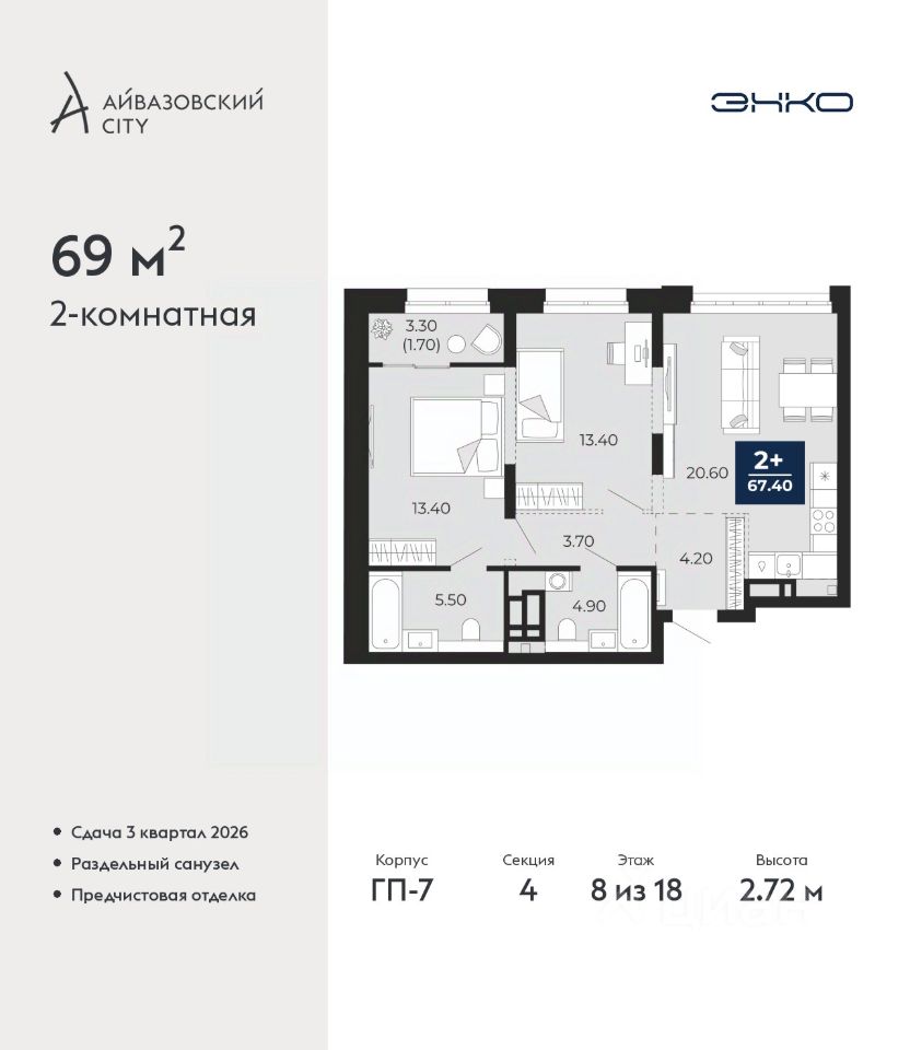 Просторная 2-комн. квартира с предчистовой отделкой в ЖК ''Айвазовский City'' на 8 этаже. Общая площадь: 69 кв.м. Высота потолков 2.72 м.