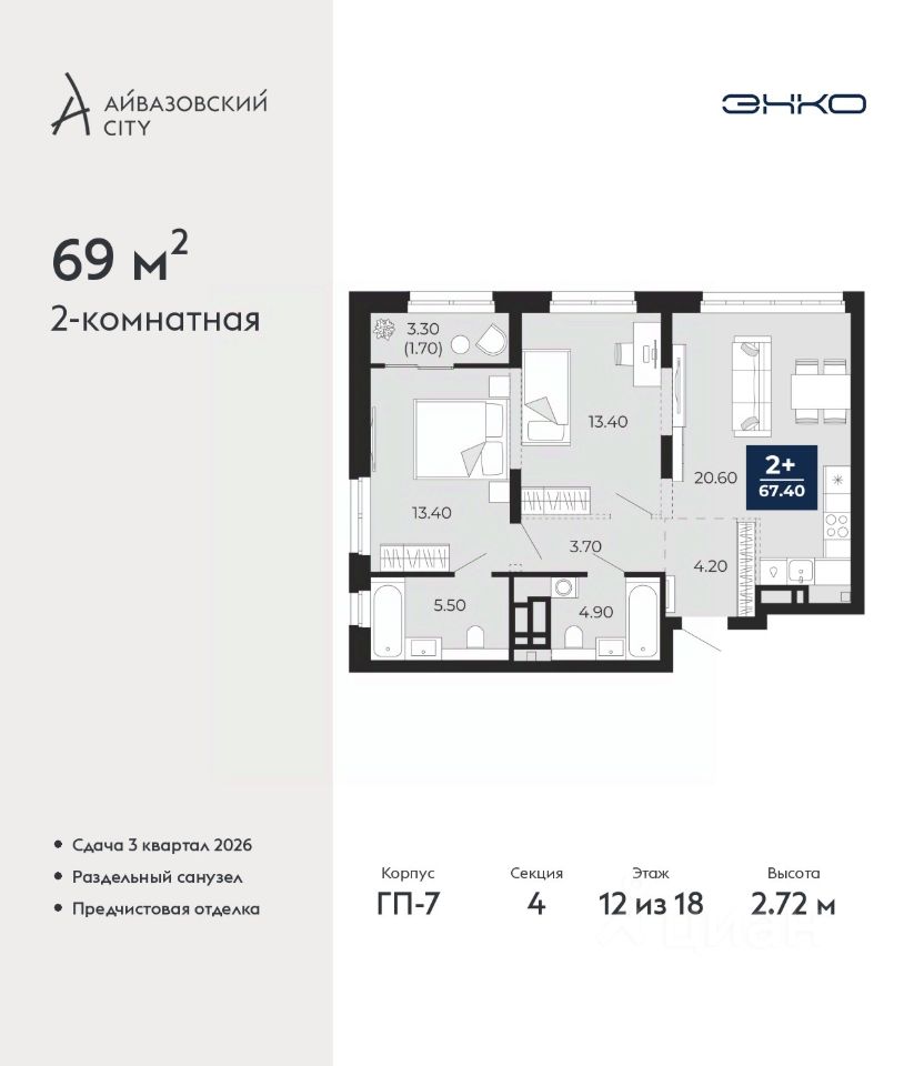 Просторная 2-комн. квартира с предчистовой отделкой в ЖК ''Айвазовский City'' на 12 этаже. Общая площадь: 69 кв.м. Высота потолков 2.72 м.