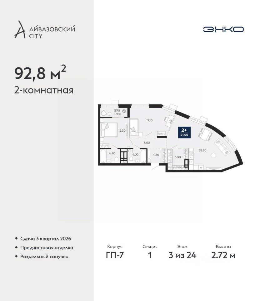 2-комн. квартира с предчистовой отделкой в ЖК ''Айвазовский City'' на 3 этаже. Общая площадь: 92.8 кв.м. Высота потолков 2.72 м.