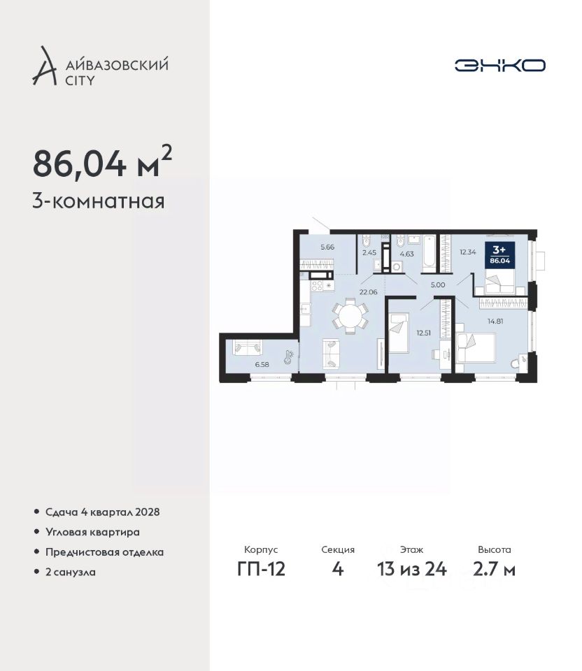 Трехкомнатная квартира с предчистовой отделкой в ЖК ''Айвазовский City'' на 13 этаже. Общая площадь: 86.04 кв.м., жилая: 39.66 кв.м., площадь просторной кухни-столовой: 22.06 кв.м. Угловая квартира, идеально подойдет любителям тишины и панорамных видов. В квартире один совмещенный и один раздельный санузел. Высота потолков 2.7 м.
