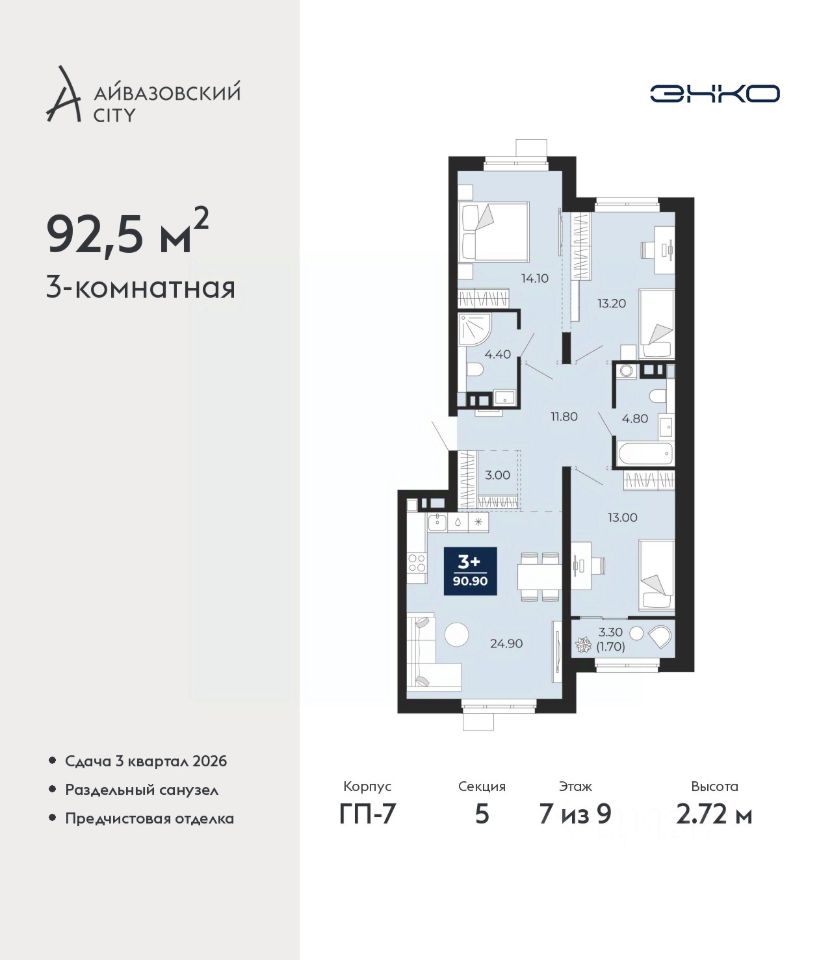 3-комн. квартира от застройщика с предчистовой отделкой в ЖК ''Айвазовский City'' на 7 этаже. Общая площадь: 92.5 кв.м. Высота потолков 2.72 м.