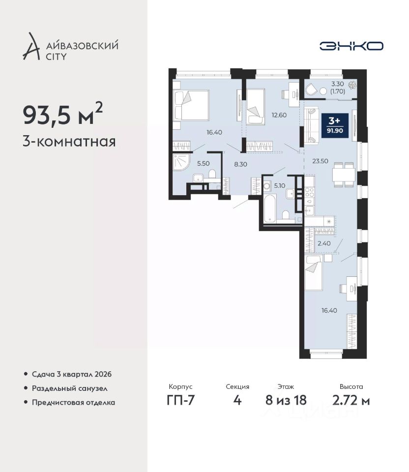 Трехкомнатная квартира с предчистовой отделкой в ЖК ''Айвазовский City'' на 8 этаже. Общая площадь: 93.5 кв.м. Высота потолков 2.72 м.