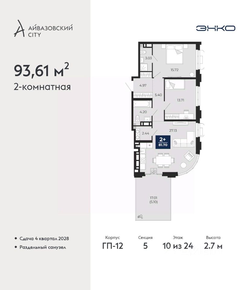 Продается двухкомнатная квартира в ЖК ''Айвазовский City'' на 10 этаже. Общая площадь: 93.61 кв.м. Высота потолков 2.7 м.