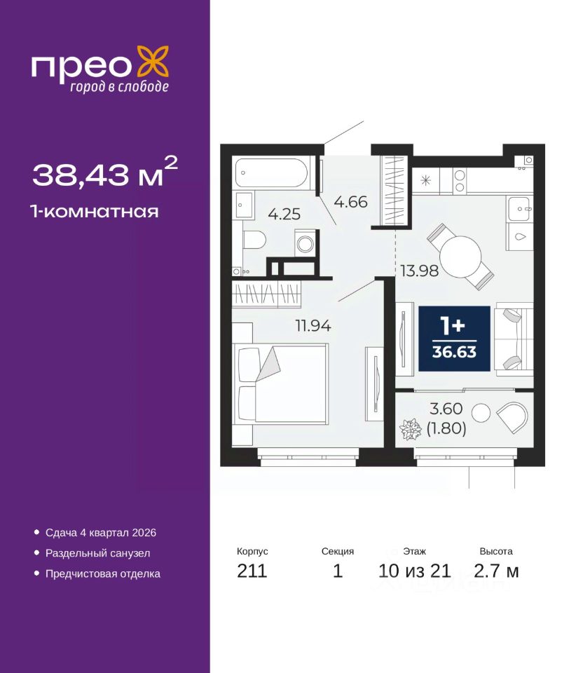 1-комн. квартира от застройщика с предчистовой отделкой в ЖК ''Прео'' на 10 этаже. Общая площадь: 38.43 кв.м., жилая: 11.94 кв.м., площадь просторной кухни-столовой: 13.98 кв.м. Все окна выходят на одну сторону. В квартире одна лоджия, один совмещенный санузел. Высота потолков 2.7 м.