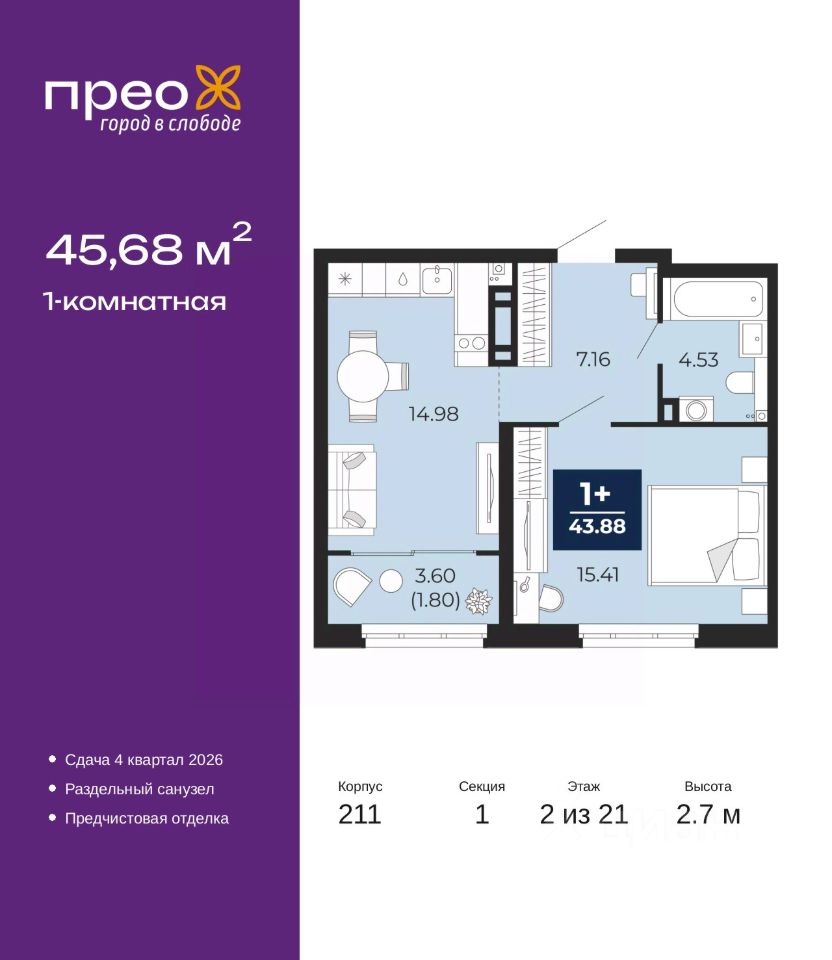 Продается однокомнатная квартира с предчистовой отделкой в ЖК ''Прео'' на 2 этаже. Общая площадь: 45.68 кв.м. Высота потолков 2.7 м.