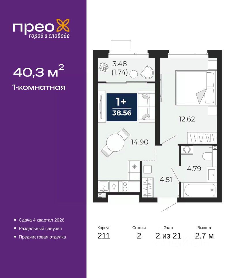 1-комн. квартира с предчистовой отделкой в ЖК ''Прео'' на 2 этаже. Общая площадь: 40.3 кв.м., жилая: 12.62 кв.м., площадь просторной кухни-столовой: 14.9 кв.м. Все окна выходят на одну сторону. В квартире одна лоджия, один совмещенный санузел. Высота потолков 2.7 м.