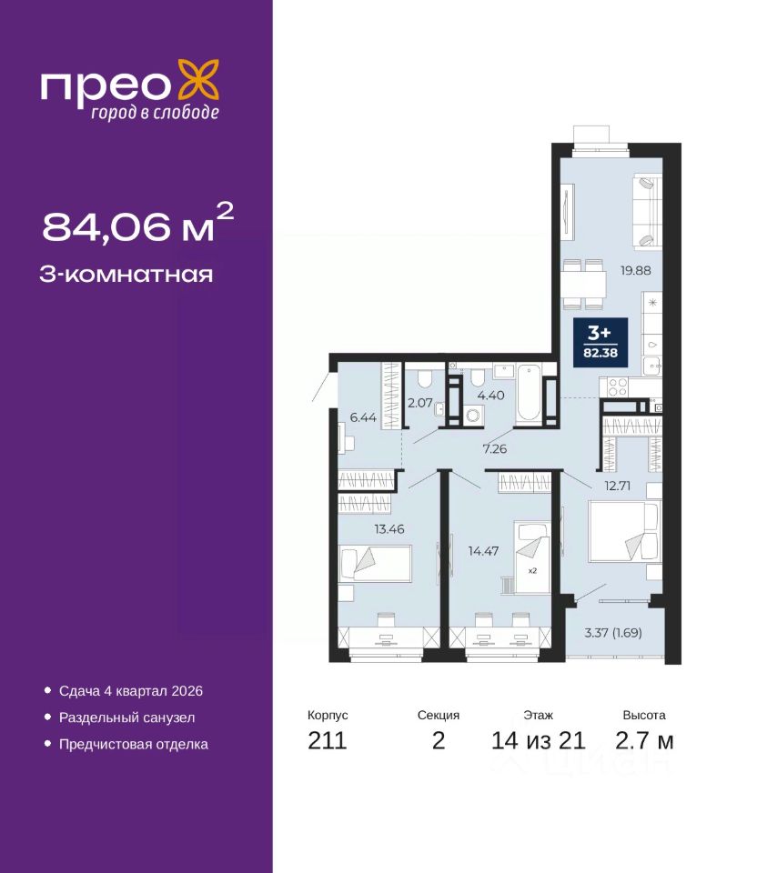 3-комн. квартира от застройщика с предчистовой отделкой в ЖК ''Прео'' на 14 этаже. Общая площадь: 84.06 кв.м. Высота потолков 2.7 м.