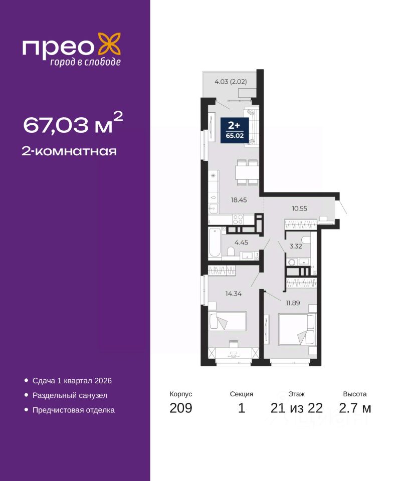 2-комн. квартира с предчистовой отделкой в ЖК ''Прео'' на 21 этаже. Общая площадь: 67.03 кв.м. Высота потолков 2.7 м.