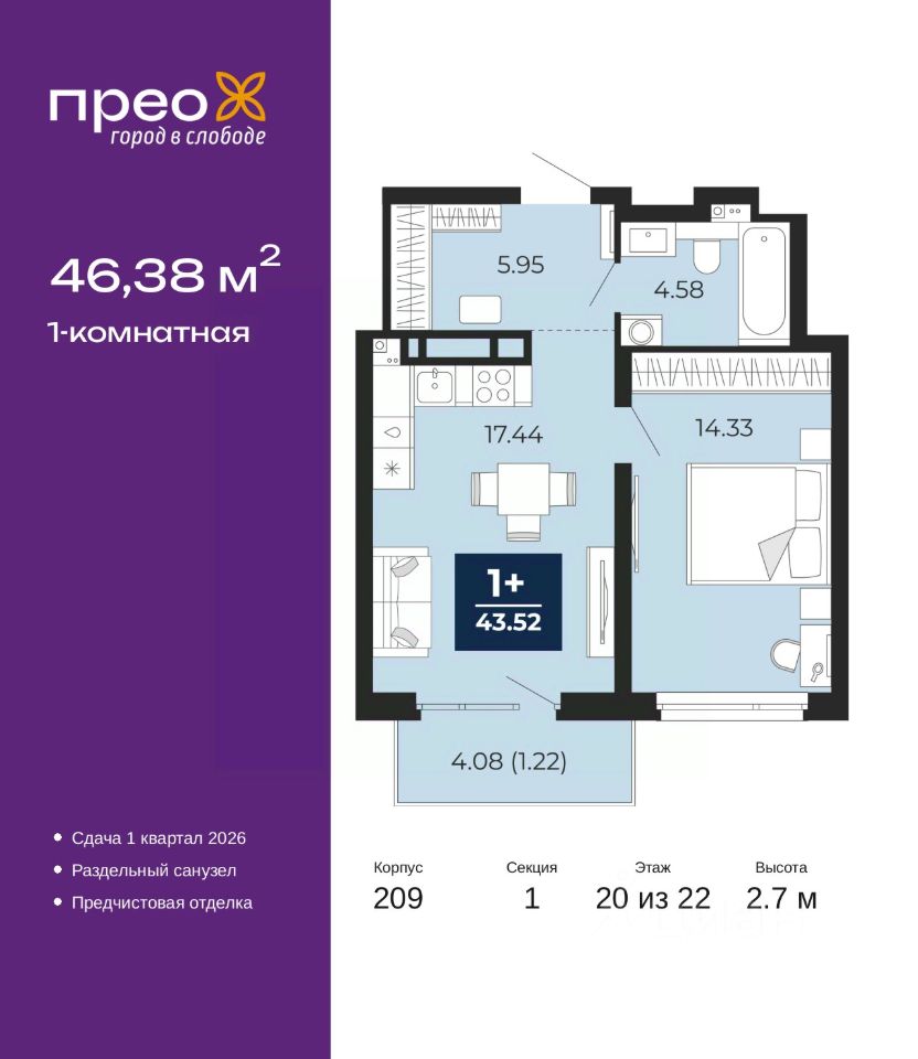 Просторная 1-комн. квартира с предчистовой отделкой в ЖК ''Прео'' на 20 этаже. Общая площадь: 46.38 кв.м. Высота потолков 2.7 м.