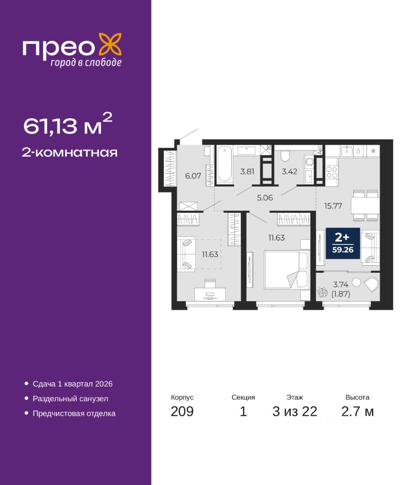 Продается 2-комн. квартира с предчистовой отделкой в ЖК ''Прео'' на 3 этаже. Общая площадь: 61.13 кв.м. Высота потолков 2.7 м.