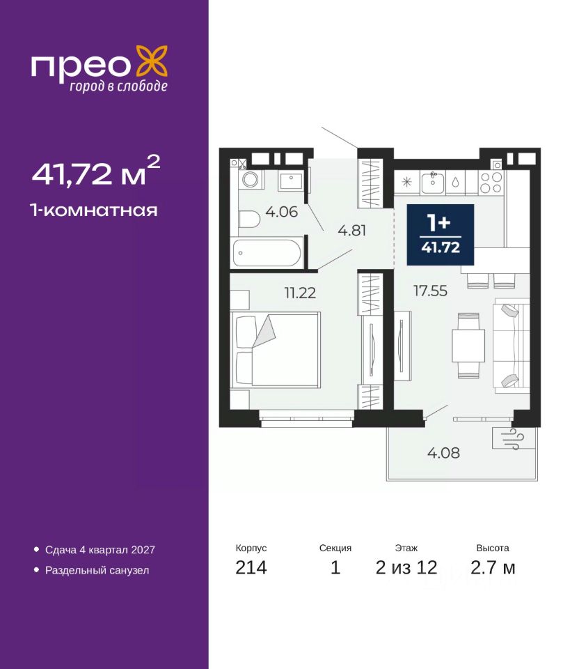 Просторная 1-комн. квартира в ЖК ''Прео'' на 2 этаже. Общая площадь: 41.72 кв.м. Высота потолков 2.7 м.