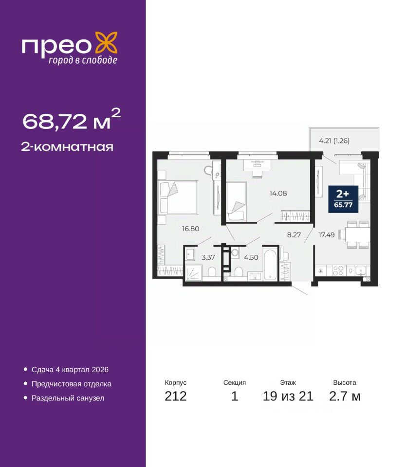 2-комн. квартира от застройщика с предчистовой отделкой в ЖК ''Прео'' на 19 этаже. Общая площадь: 68.72 кв.м. Высота потолков 2.7 м.
