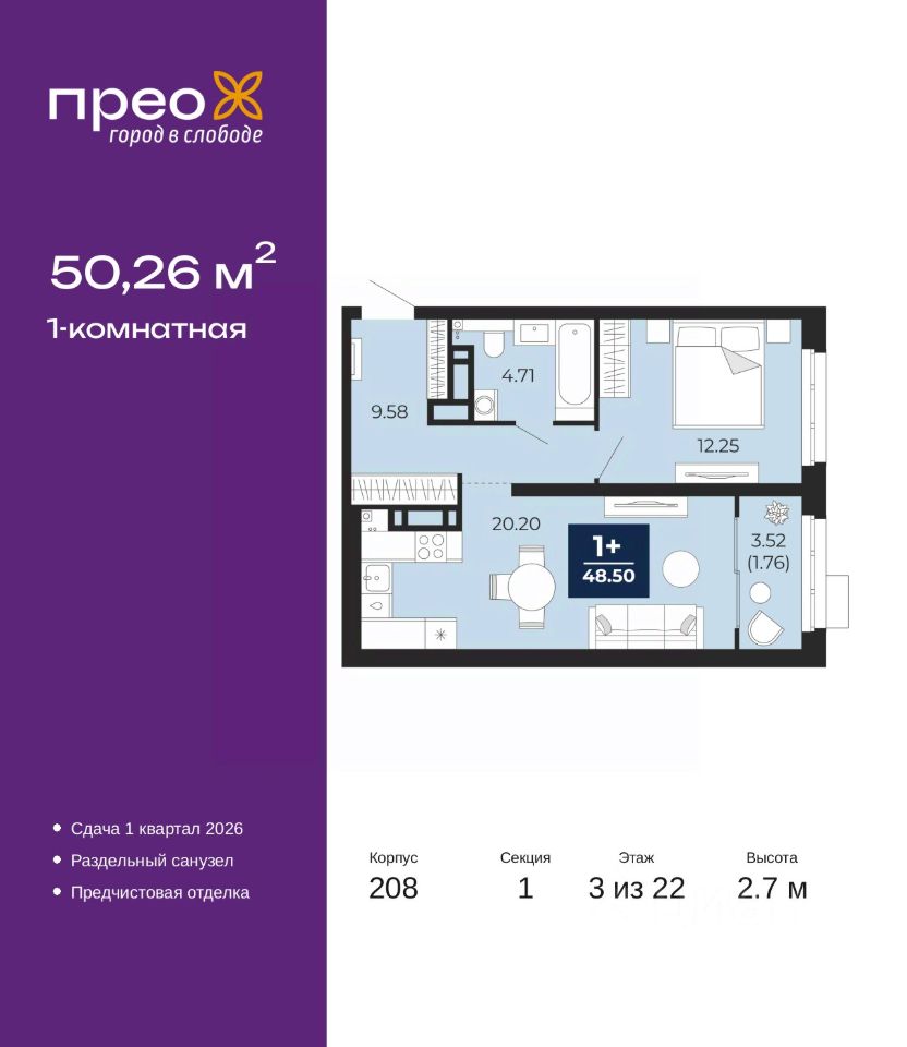Продается 1-комн. квартира от застройщика с предчистовой отделкой в ЖК ''Прео'' на 3 этаже. Общая площадь: 50.26 кв.м. Высота потолков 2.7 м.