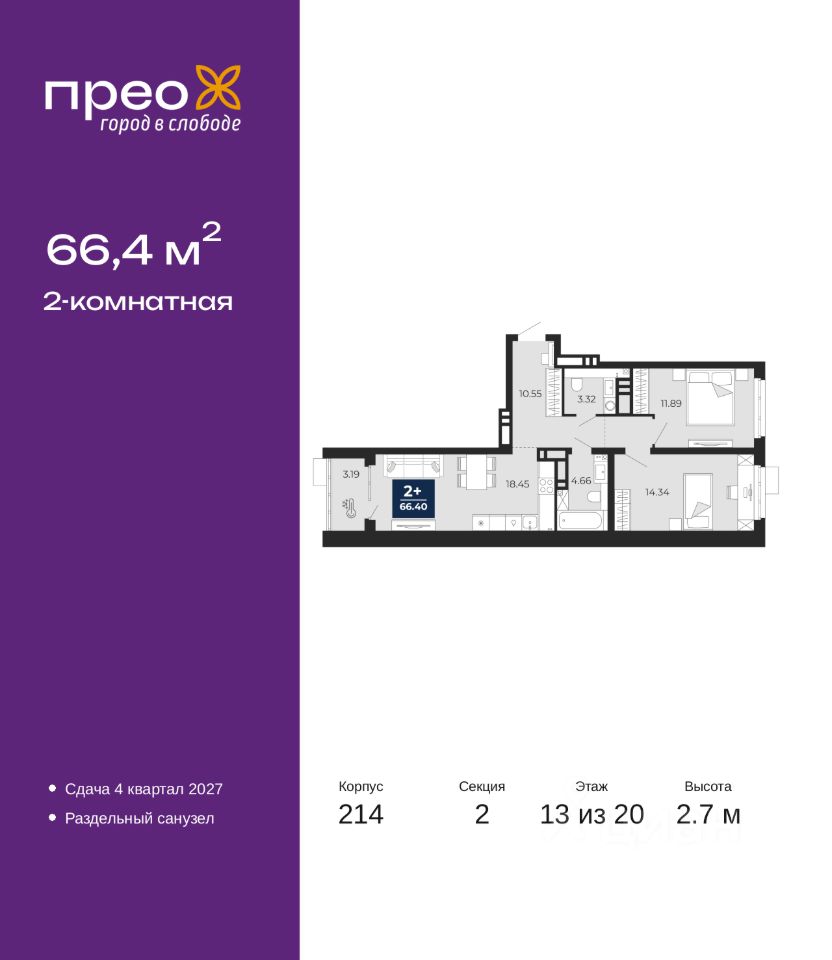 2-комн. квартира от застройщика в ЖК ''Прео'' на 13 этаже. Общая площадь: 66.4 кв.м. Высота потолков 2.7 м.