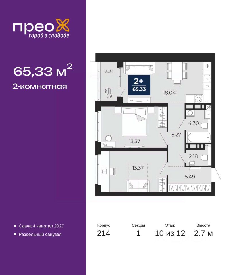 Продается двухкомнатная квартира от застройщика в ЖК ''Прео'' на 10 этаже. Общая площадь: 65.33 кв.м. Высота потолков 2.7 м.