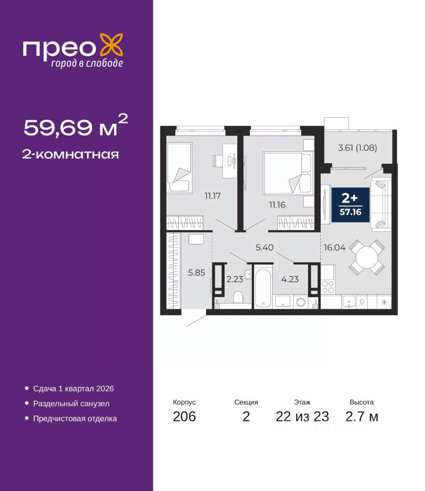 2-комн. квартира от застройщика с предчистовой отделкой в ЖК ''Прео'' на 22 этаже. Общая площадь: 59.69 кв.м. Высота потолков 2.7 м.