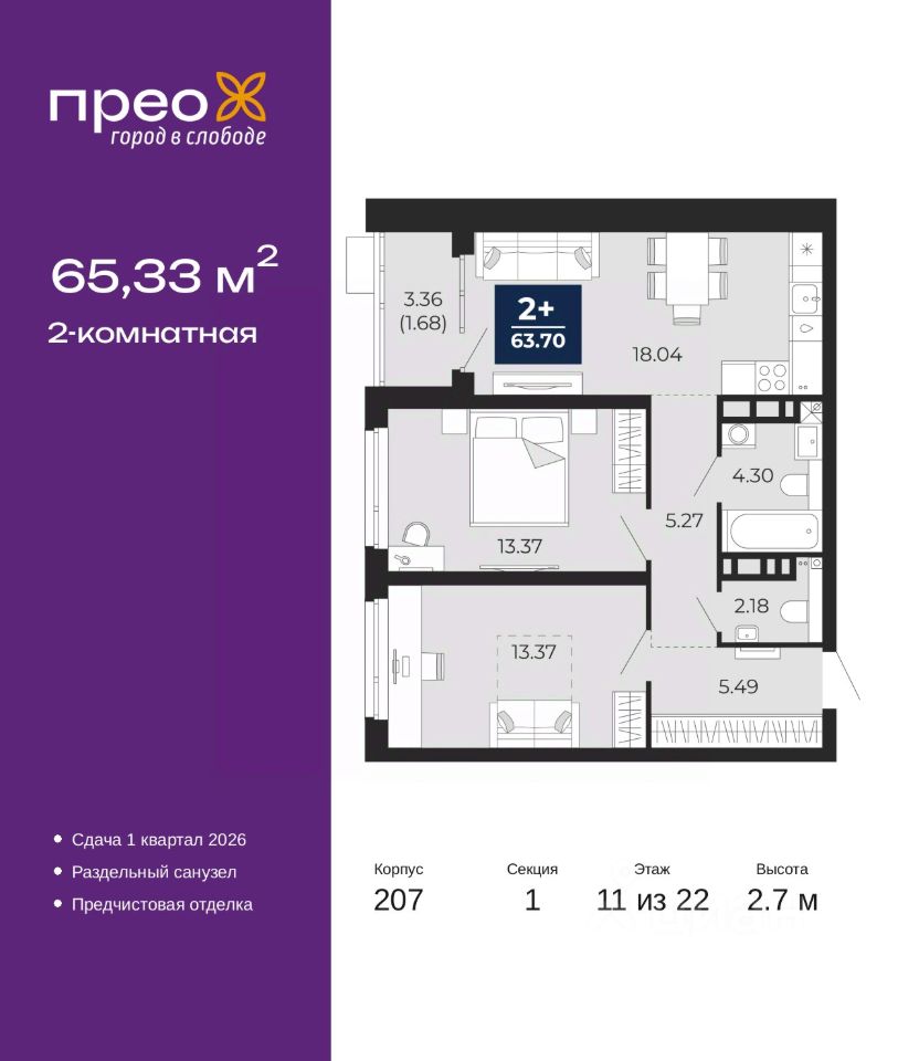 Продается 2-комн. квартира с предчистовой отделкой в ЖК ''Прео'' на 11 этаже. Общая площадь: 65.33 кв.м. Высота потолков 2.7 м.