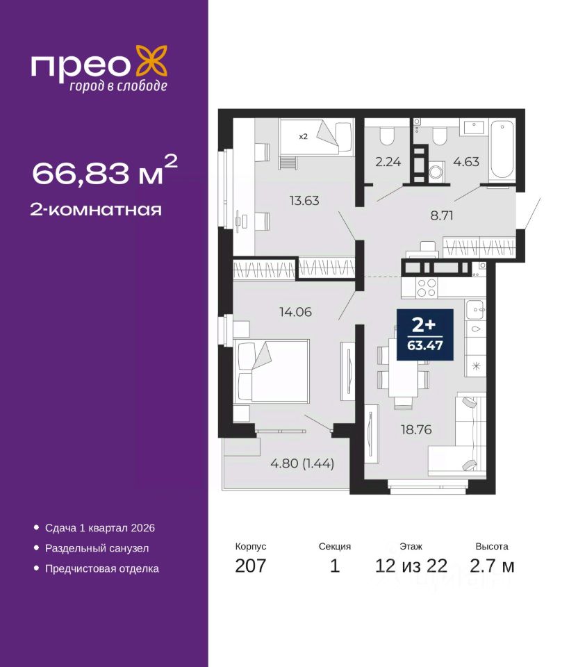 Просторная двухкомнатная квартира с предчистовой отделкой в ЖК ''Прео'' на 12 этаже. Общая площадь: 66.83 кв.м. Высота потолков 2.7 м.