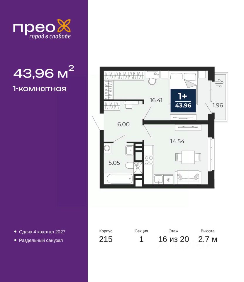 Продается 1-комн. квартира в ЖК ''Прео'' на 16 этаже. Общая площадь: 43.96 кв.м. Высота потолков 2.7 м.