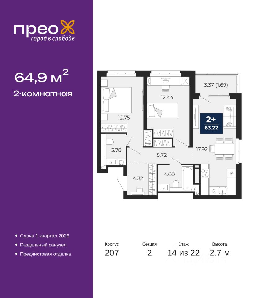 Продается двухкомнатная квартира с предчистовой отделкой в ЖК ''Прео'' на 14 этаже. Общая площадь: 64.9 кв.м. Высота потолков 2.7 м.