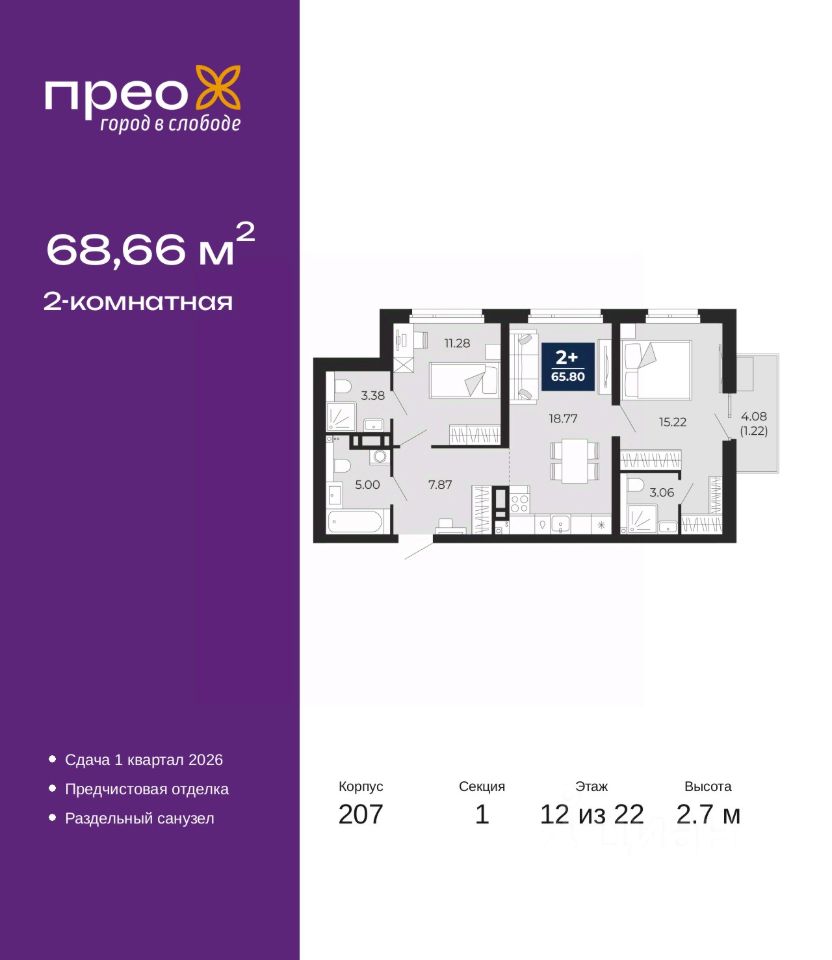 Продается 2-комн. квартира с предчистовой отделкой в ЖК ''Прео'' на 12 этаже. Общая площадь: 68.66 кв.м. Высота потолков 2.7 м.