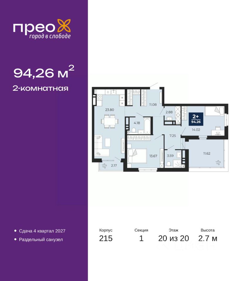 Двухкомнатная квартира в ЖК ''Прео'' на 20 этаже. Общая площадь: 94.26 кв.м. Высота потолков 2.7 м.