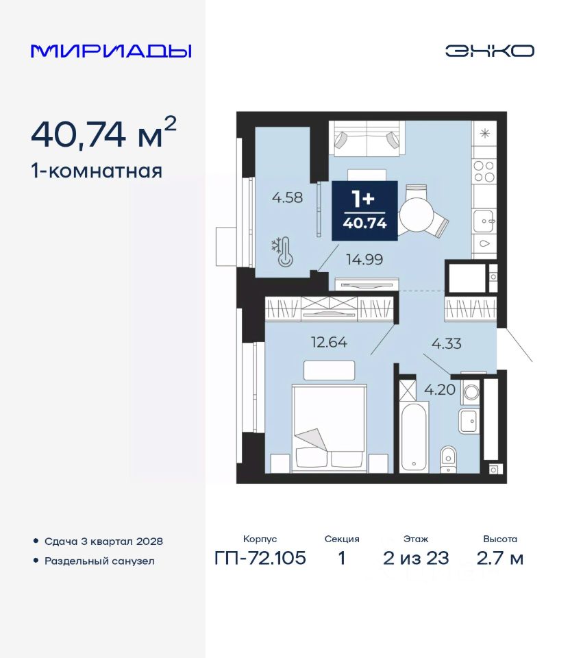 Продается однокомнатная квартира от застройщика в ЖК ''Мириады'' на 2 этаже. Общая площадь: 40.74 кв.м. Высота потолков 2.7 м.