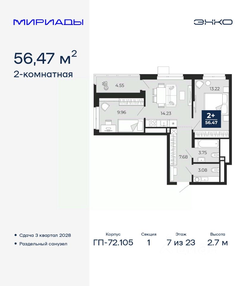 2-комн. квартира в ЖК ''Мириады'' на 7 этаже. Общая площадь: 56.47 кв.м. Высота потолков 2.7 м.