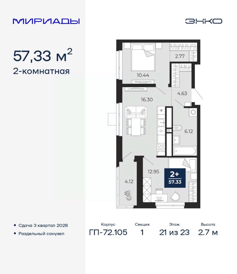 2-комн. квартира в ЖК ''Мириады'' на 21 этаже. Общая площадь: 57.33 кв.м. Высота потолков 2.7 м.