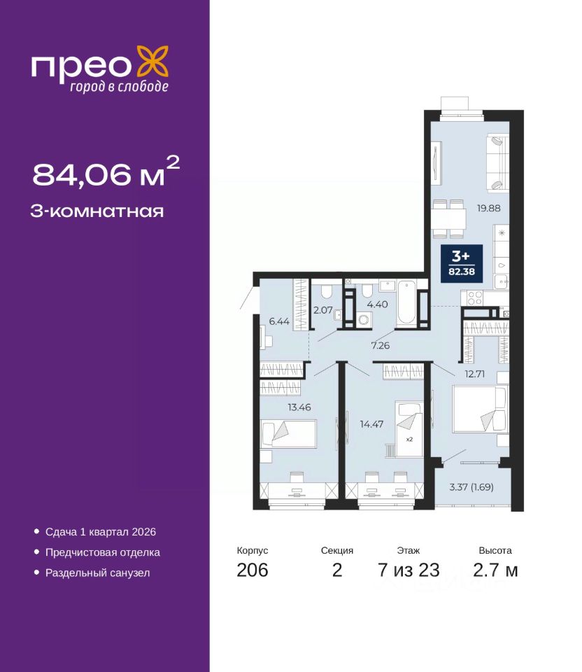 3-комн. квартира с предчистовой отделкой в ЖК ''Прео'' на 7 этаже. Общая площадь: 84.06 кв.м. Высота потолков 2.7 м.