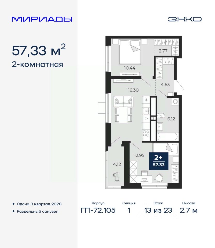 Двухкомнатная квартира от застройщика в ЖК ''Мириады'' на 13 этаже. Общая площадь: 57.33 кв.м. Высота потолков 2.7 м.