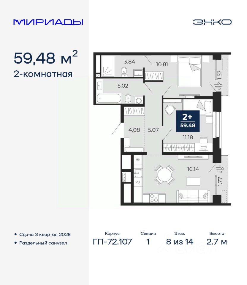 Продается 2-комн. квартира в ЖК ''Мириады'' на 8 этаже. Общая площадь: 59.48 кв.м. Высота потолков 2.7 м.