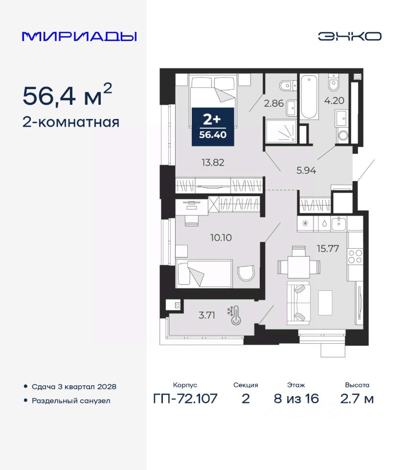 Просторная 2-комн. квартира в ЖК ''Мириады'' на 8 этаже. Общая площадь: 56.4 кв.м. Высота потолков 2.7 м.
