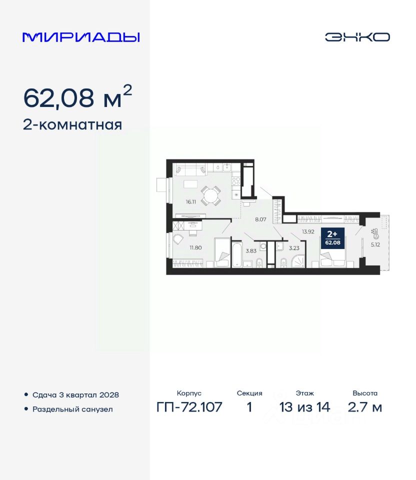 Продается 2-комн. квартира от застройщика в ЖК ''Мириады'' на 13 этаже. Общая площадь: 62.08 кв.м. Высота потолков 2.7 м.