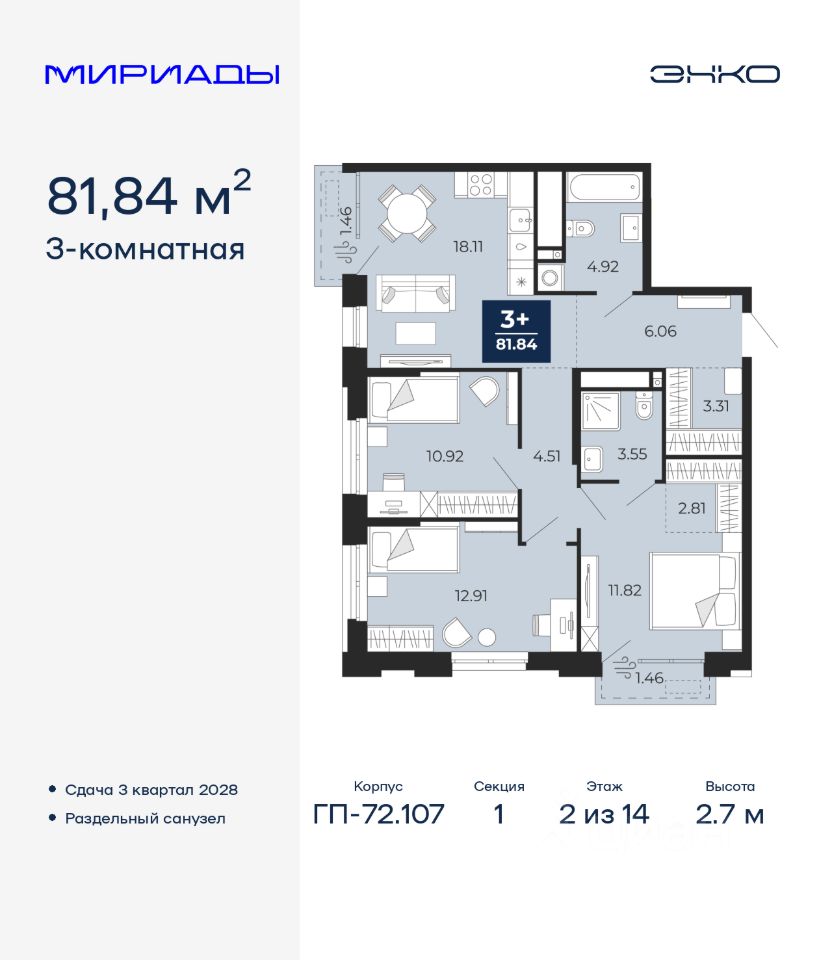 Просторная 3-комн. квартира в ЖК ''Мириады'' на 2 этаже. Общая площадь: 81.84 кв.м. Высота потолков 2.7 м.