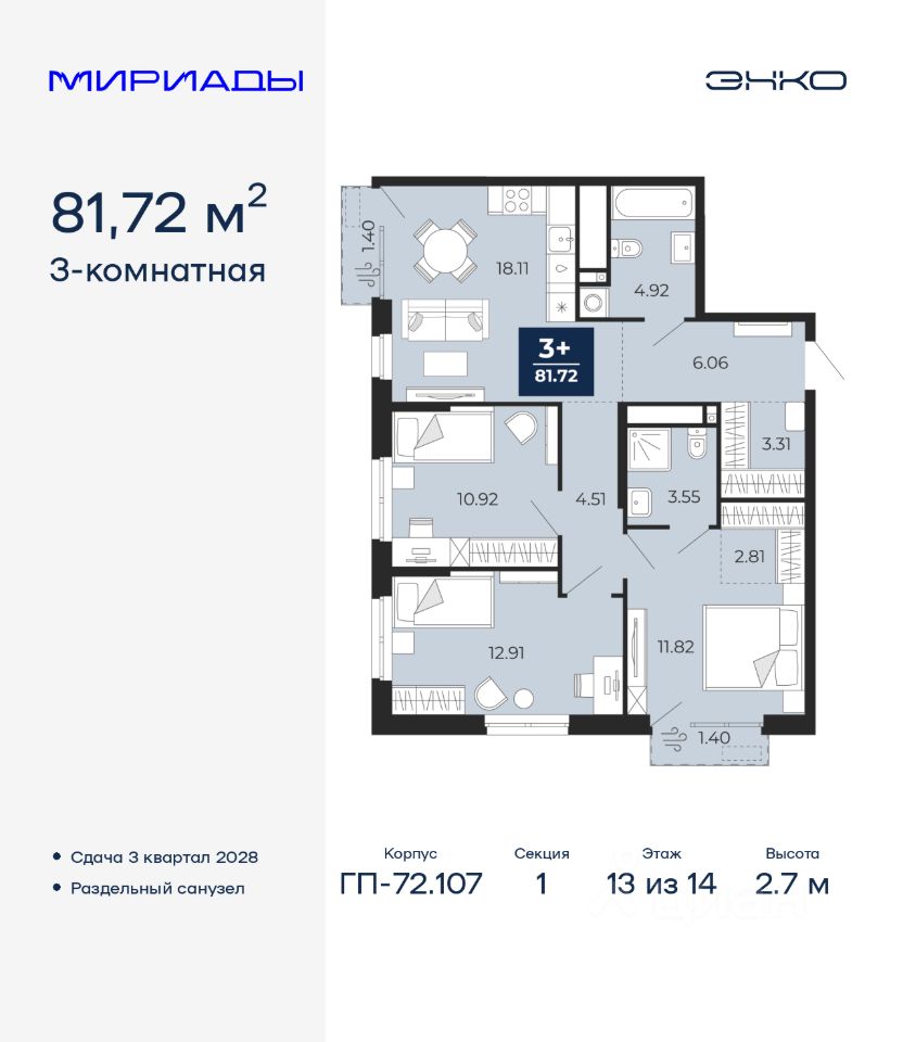 3-комн. квартира от застройщика в ЖК ''Мириады'' на 13 этаже. Общая площадь: 81.72 кв.м. Высота потолков 2.7 м.