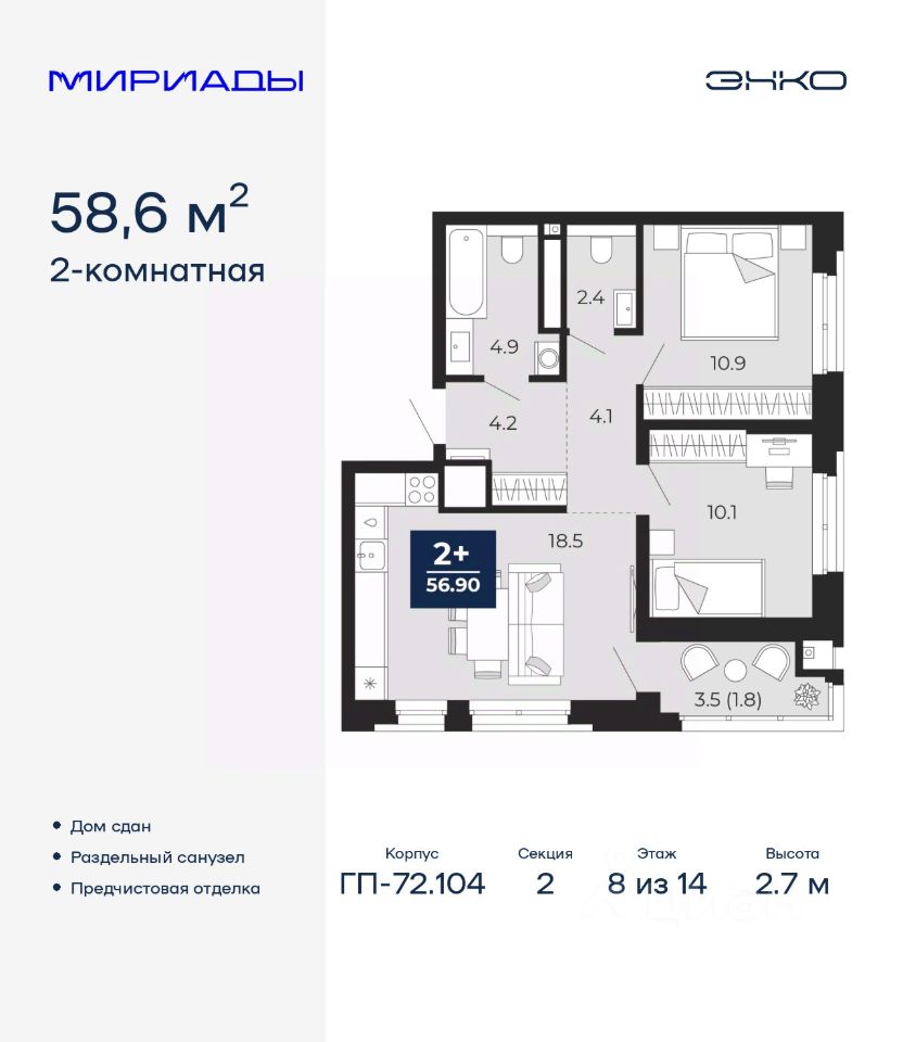 Продается двухкомнатная квартира с предчистовой отделкой в ЖК ''Мириады'' на 8 этаже. Общая площадь: 58.6 кв.м. Высота потолков 2.7 м.