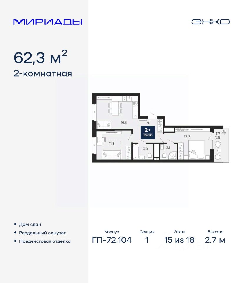 2-комн. квартира с предчистовой отделкой в ЖК ''Мириады'' на 15 этаже. Общая площадь: 62.3 кв.м. Высота потолков 2.7 м.