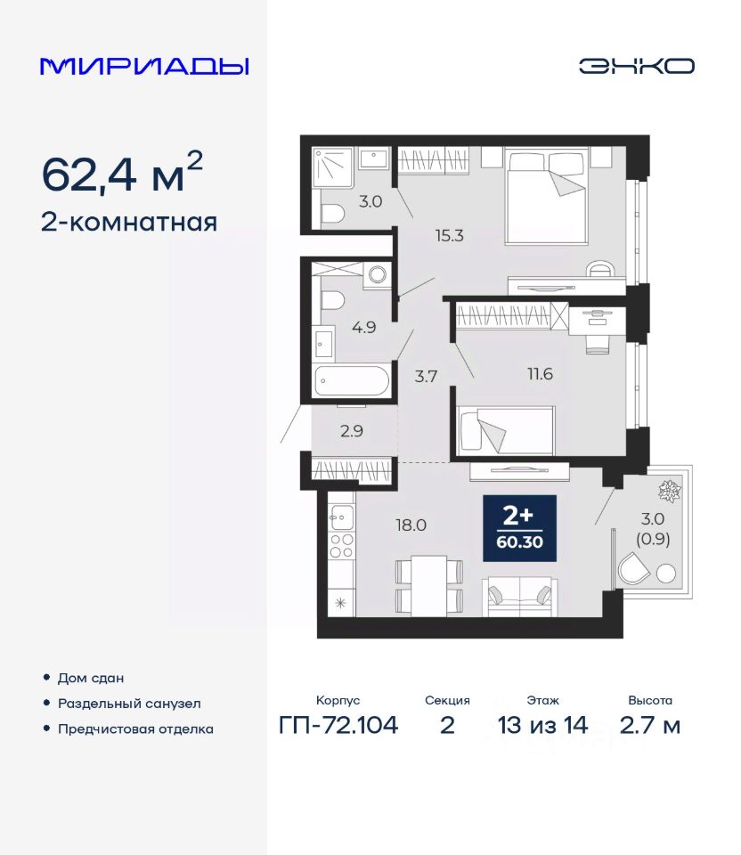 Просторная 2-комн. квартира с предчистовой отделкой в ЖК ''Мириады'' на 13 этаже. Общая площадь: 62.4 кв.м. Высота потолков 2.7 м.