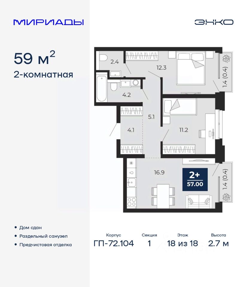 2-комн. квартира от застройщика с предчистовой отделкой в ЖК ''Мириады'' на 18 этаже. Общая площадь: 59 кв.м. Высота потолков 2.7 м.