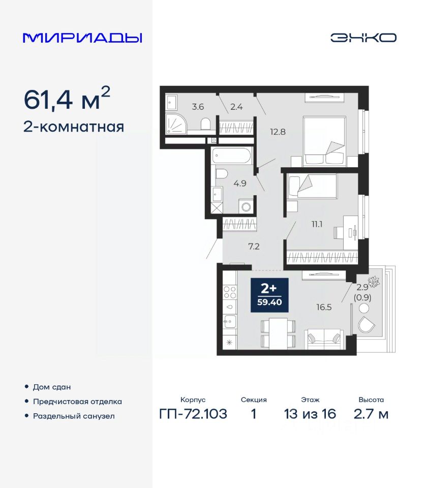 2-комн. квартира с предчистовой отделкой в ЖК ''Мириады'' на 13 этаже. Общая площадь: 61.4 кв.м. Высота потолков 2.7 м.