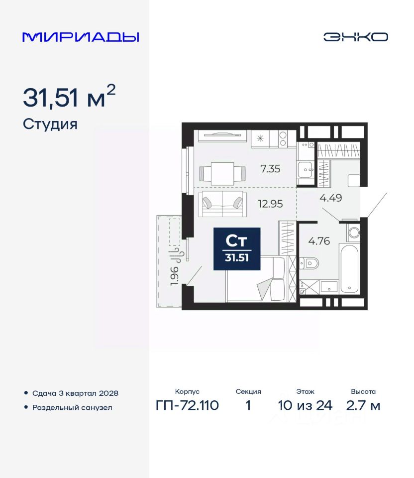 1-комн. квартира-студия от застройщика в ЖК ''Мириады'' на 10 этаже. Общая площадь: 31.51 кв.м. Высота потолков 2.7 м.