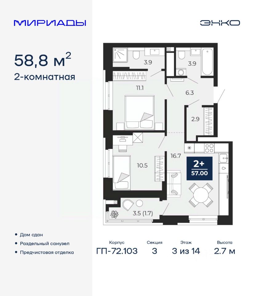 Просторная 2-комн. квартира с предчистовой отделкой в ЖК ''Мириады'' на 3 этаже. Общая площадь: 58.8 кв.м. Высота потолков 2.7 м.