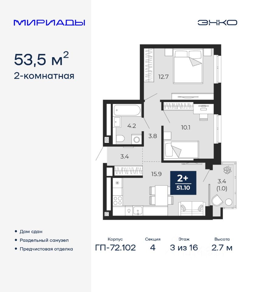 Просторная 2-комн. квартира с предчистовой отделкой в ЖК ''Мириады'' на 3 этаже. Общая площадь: 53.5 кв.м. Высота потолков 2.7 м.