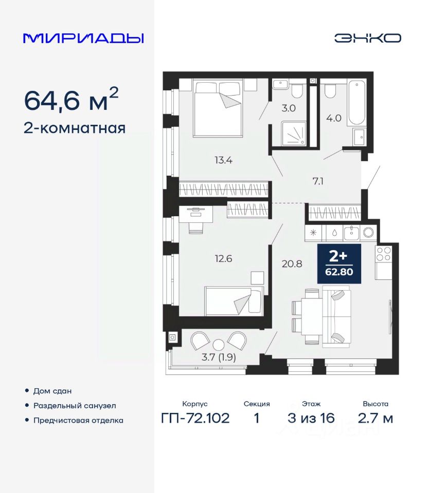 2-комн. квартира с предчистовой отделкой в ЖК ''Мириады'' на 3 этаже. Общая площадь: 64.6 кв.м. Высота потолков 2.7 м.