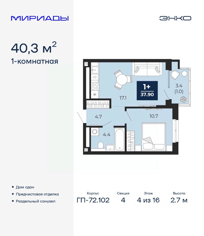 Просторная 1-комн. квартира с предчистовой отделкой в ЖК ''Мириады'' на 4 этаже. Общая площадь: 40.3 кв.м. Высота потолков 2.7 м.